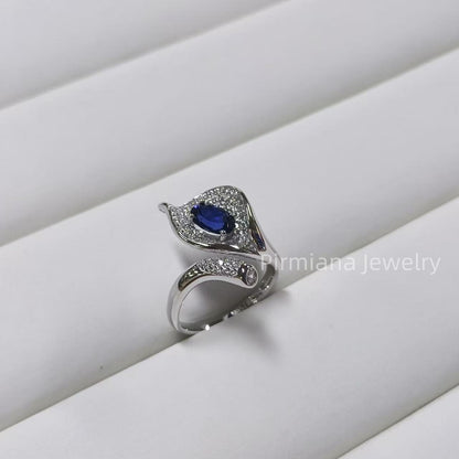 Pirmiana Handcrafted S925 Silver Lab Grown Sapphire Ring | Artistic Leaf-Shaped Statement Jewelry for Women