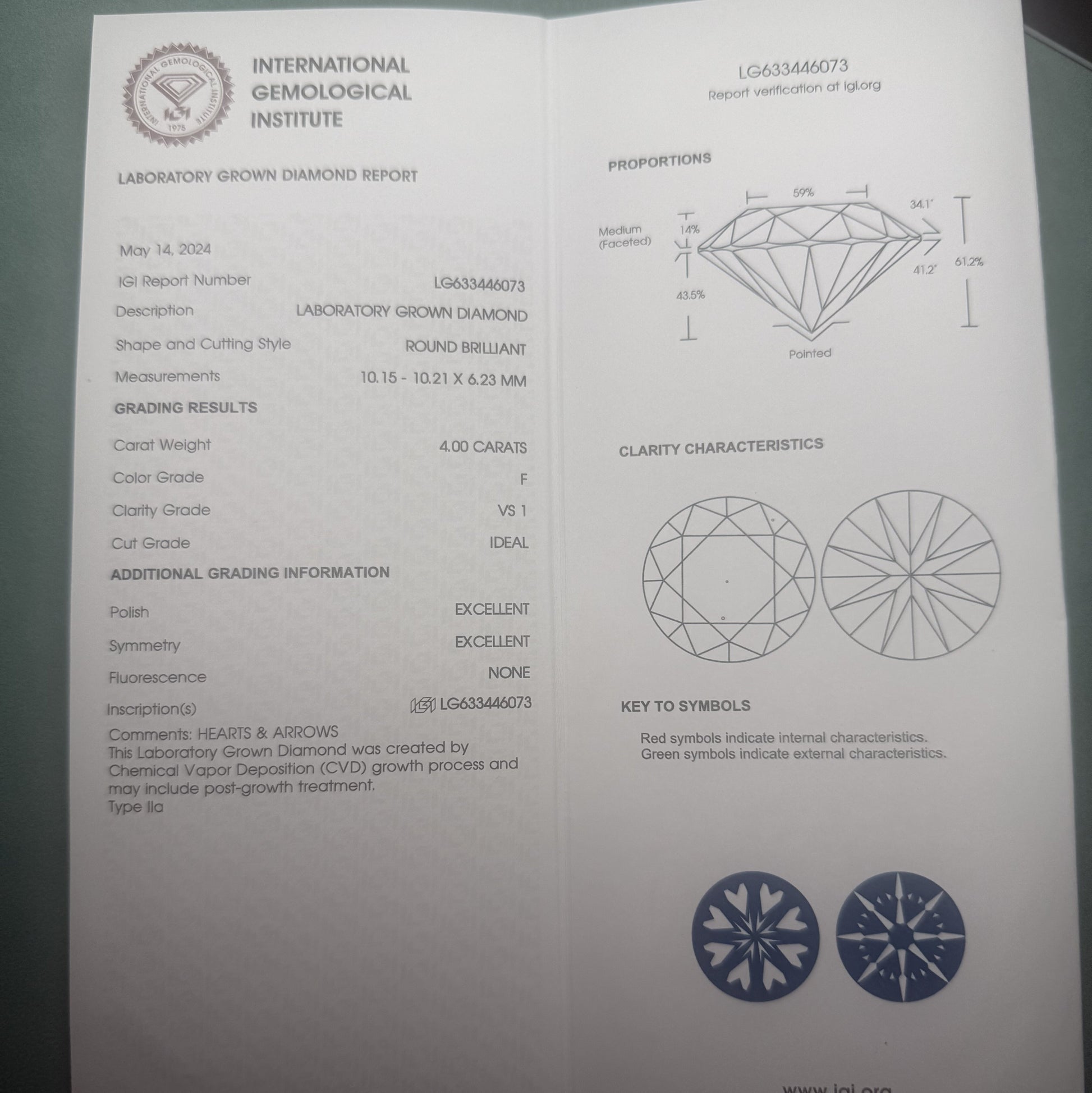 main stone: 4ct F VS1 CVD lab grown diamond with IGI certificate