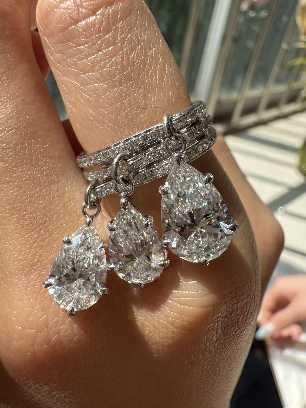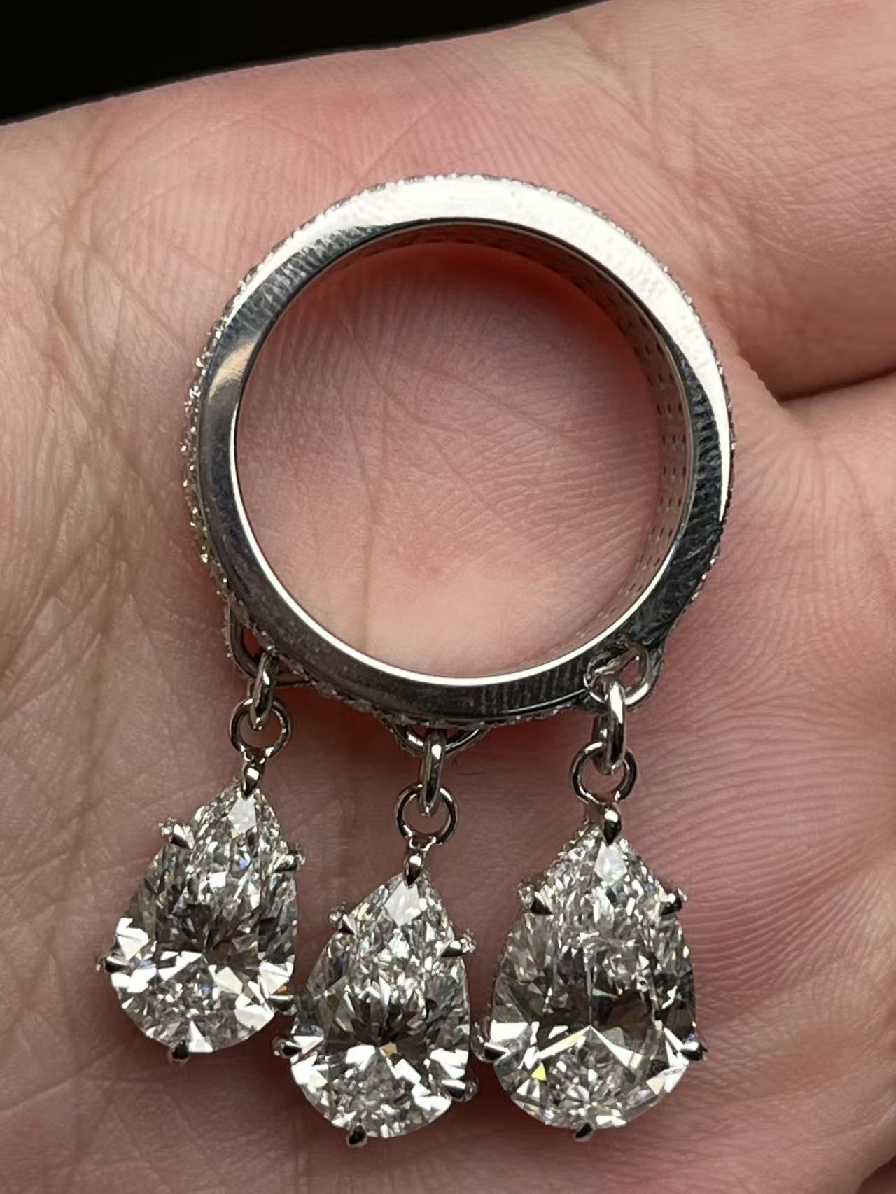 main stone: all EF color pear shape CVD lab grown diamond with IGI certificate. 3.02ct lab diamond(12.13*7.97*5.2mm)/2.10ct lab diamond(11.43*7.22*4.51mm)/2.02ct lab diamond(11.25*7.14*4.88mm)