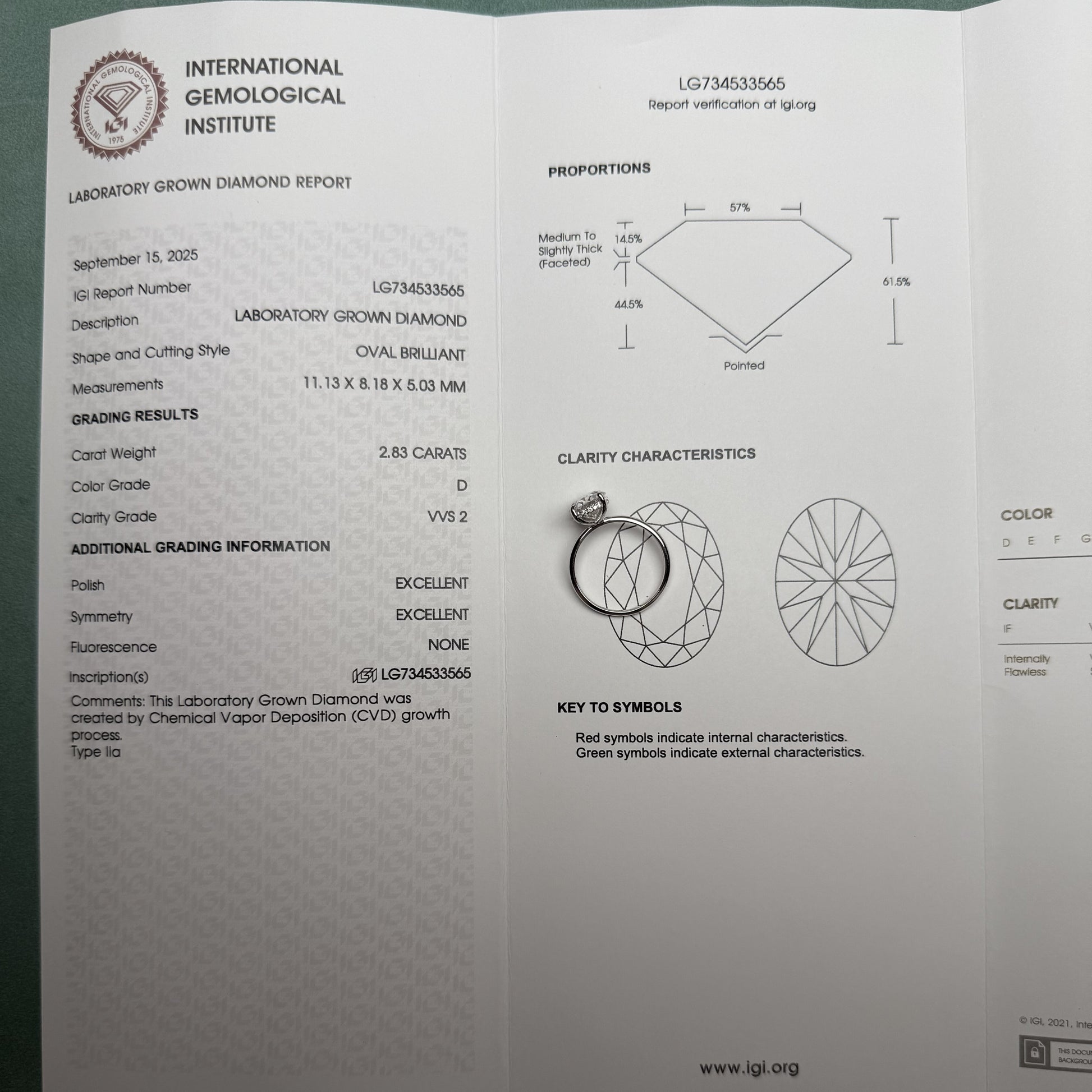 main stone: 2.8ct D VVS2 CVD lab grown diamond with IGI certificate