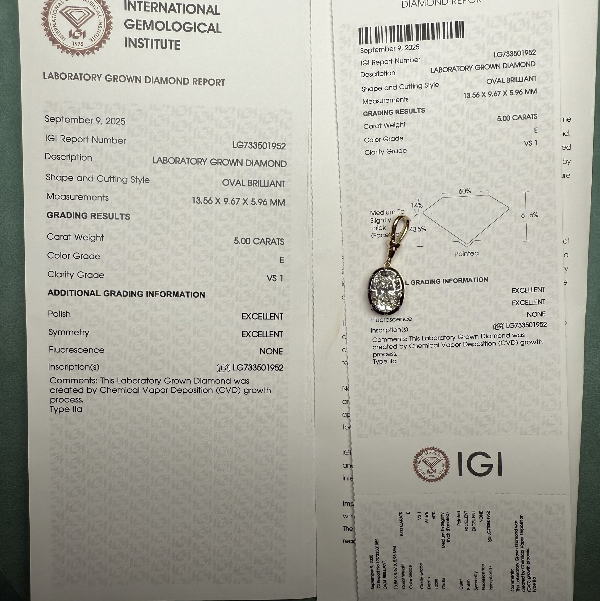pendant main stone: 5ct CVD lab grown diamond with IGI certificate