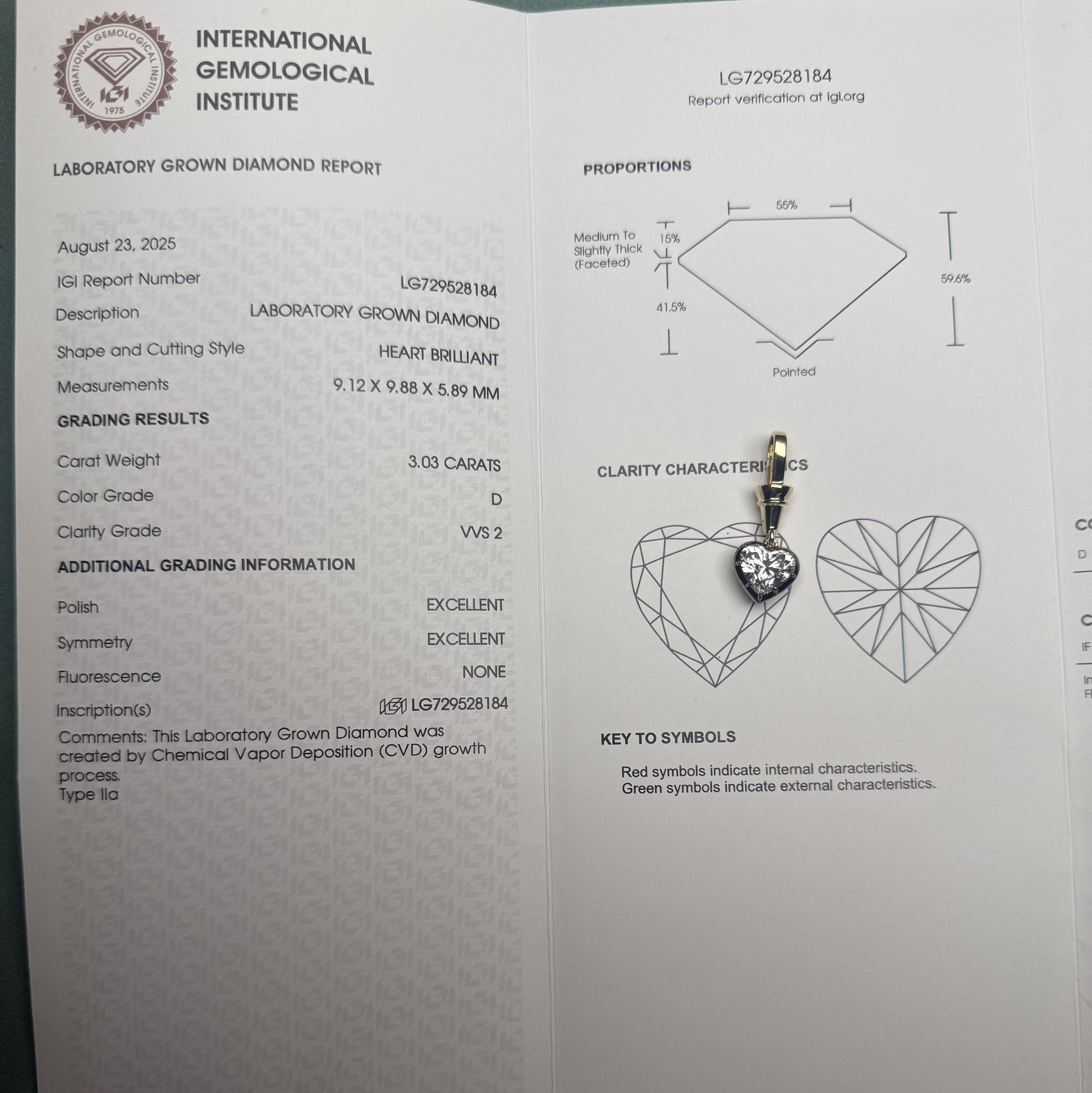 pendant main stone: 3ct heart shape CVD D VVS2 lab grown diamond with IGI certifacete