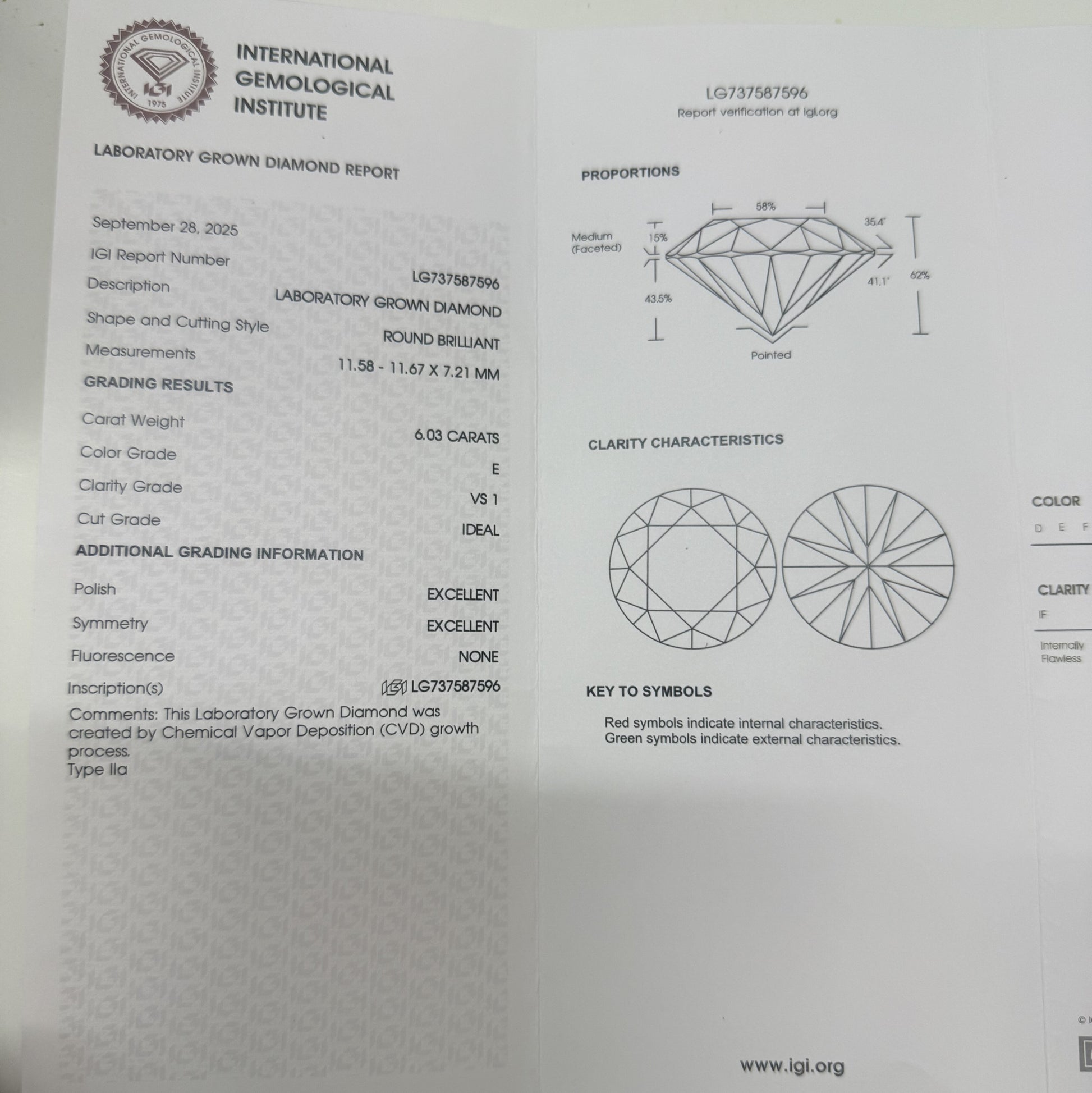 main stone: 6ct E VS1 CVD lab grown diamond with IGI certificate